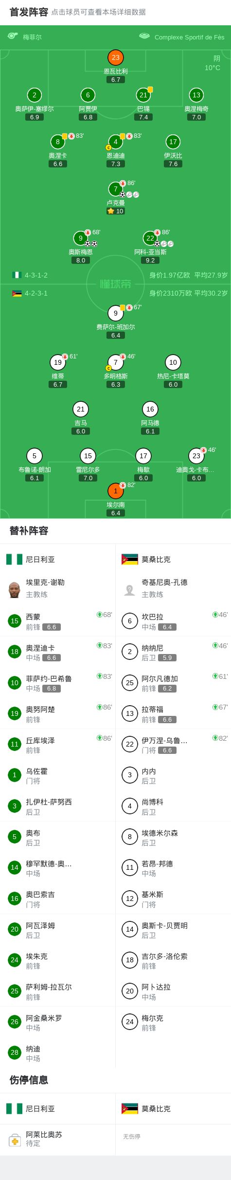 第20分钟,阿科-亚当斯横传中路,卢克曼推射破门,尼日利亚1-0莫桑比克